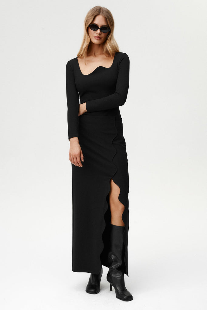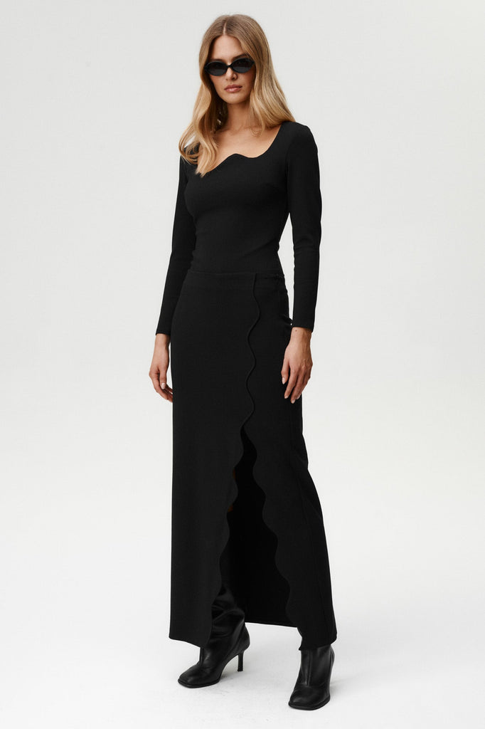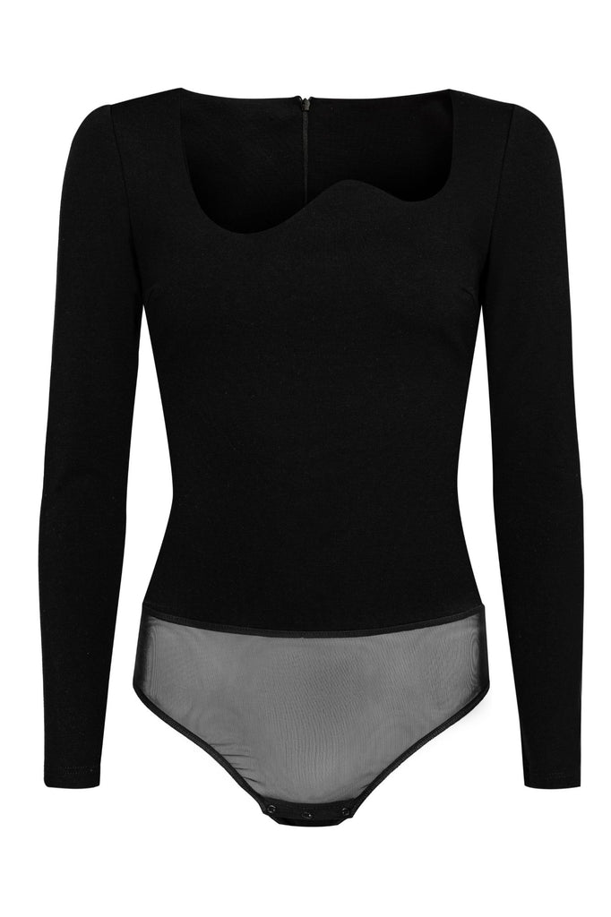 - Body z asymetrycznym dekoltem w kształcie fali.
