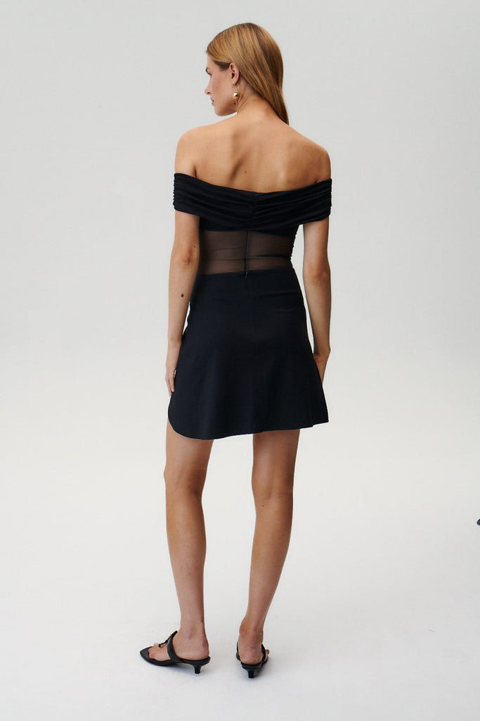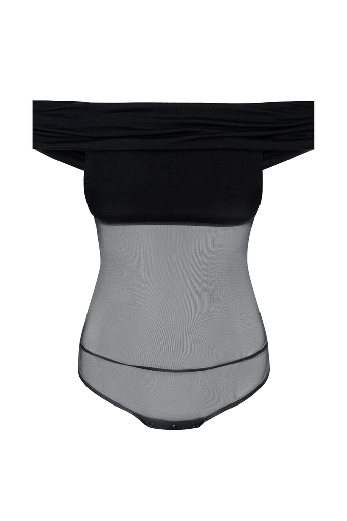 Czarny body z opuszczonymi ramionami i drapowanym dekoltem.