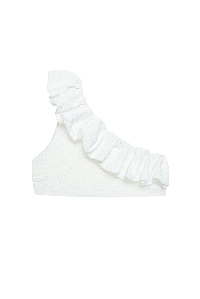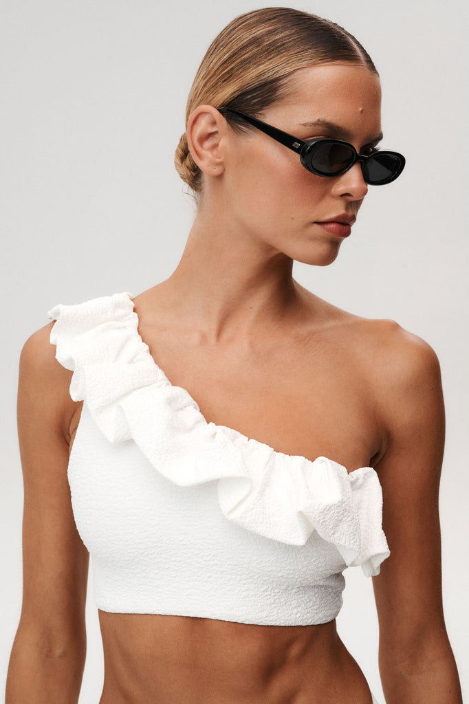 - Asymetryczny top z ozdobną falbaną.