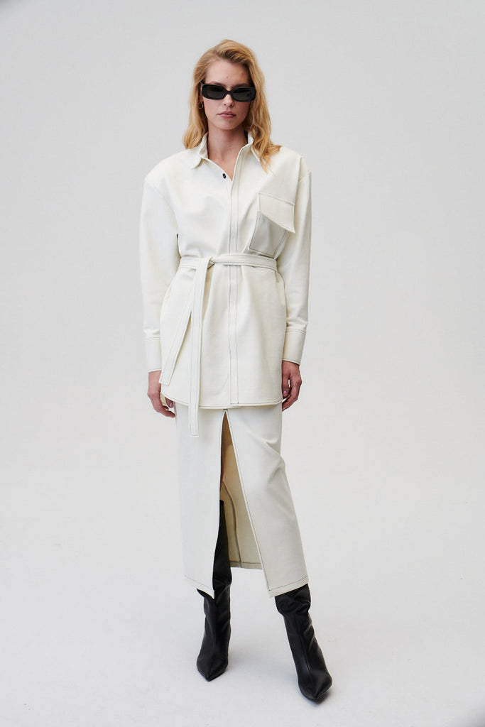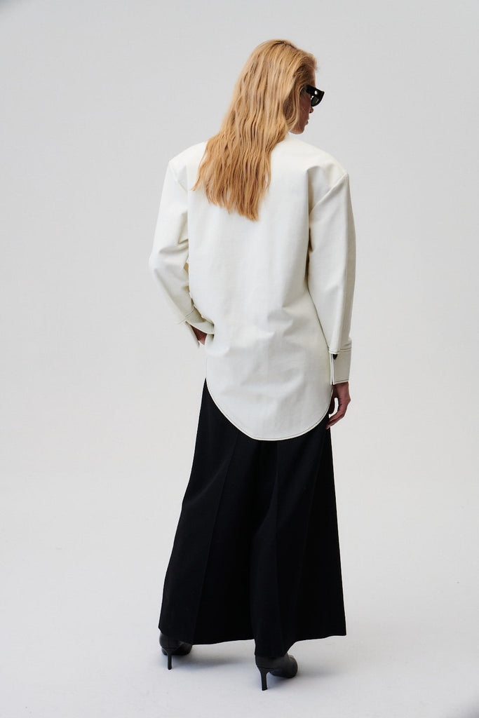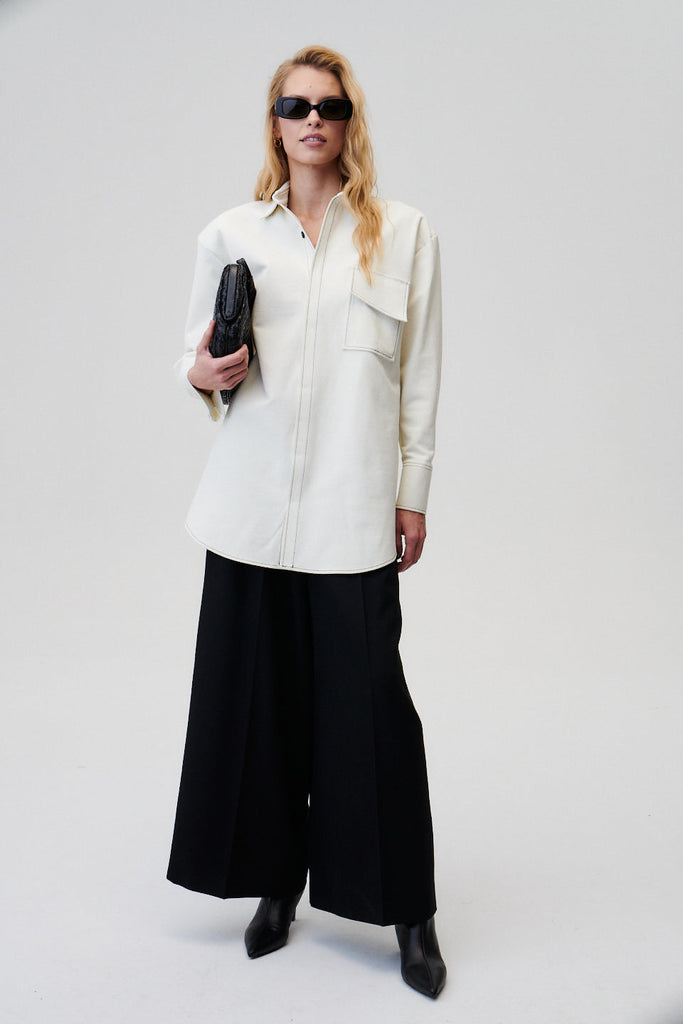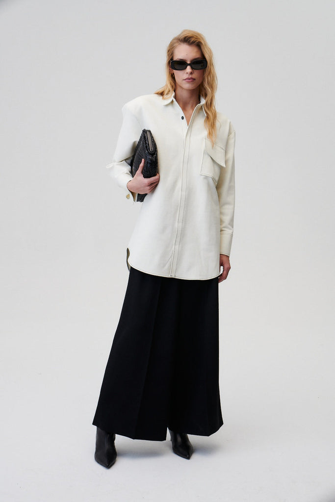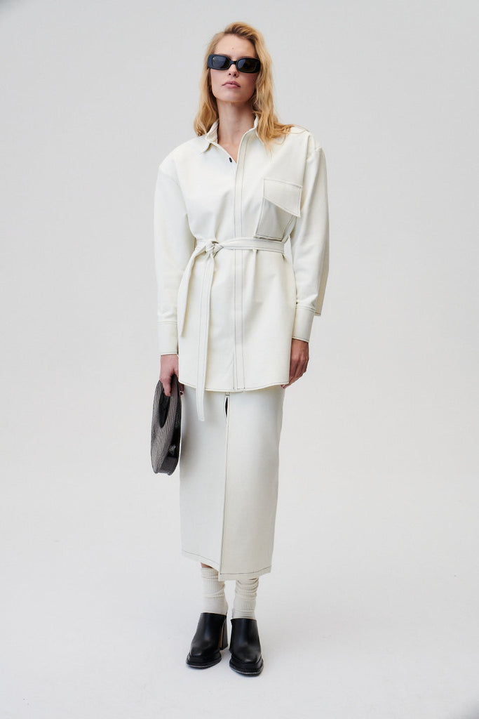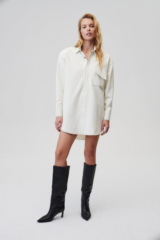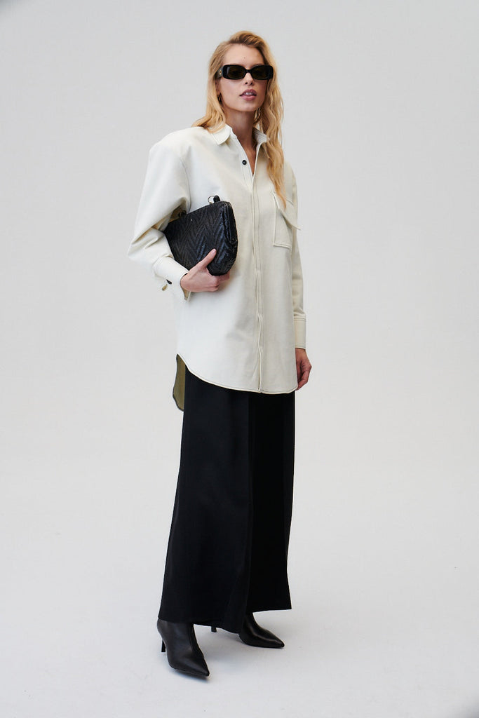 Koszula Hailey, czyli wszechstronność w nowoczesnym wydaniu. Możesz nosić ją luźno w oversize’owym stylu lub przewiązać w talii paskiem, by nadać sylwetce bardziej wyrazisty kształt. Uszyta z miękkiej, ale trzymającej formę tkaniny, przyciąga wzrok kontrastowymi przeszyciami, pojemną kieszenią i subtelnie zaokrąglonym dołem. Świetnie sprawdzi się jako sukienka zestawiona z kozakami lub jako lekka narzutka do obcisłych spodni. Hailey łączy w sobie luz i szyk, dając Ci wiele możliwości stylizacji.