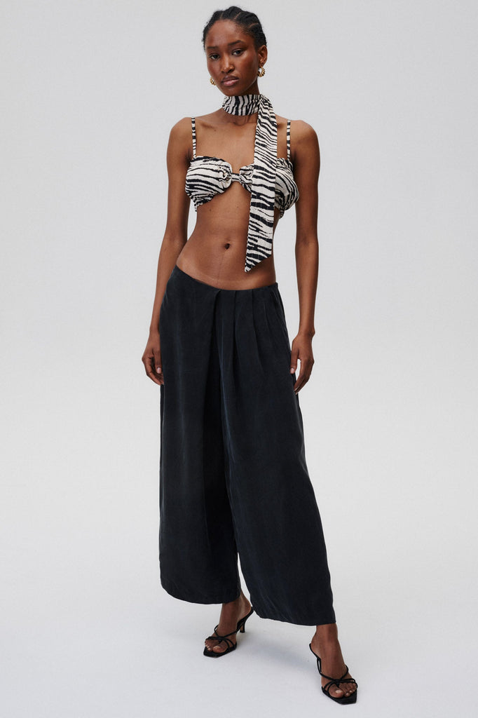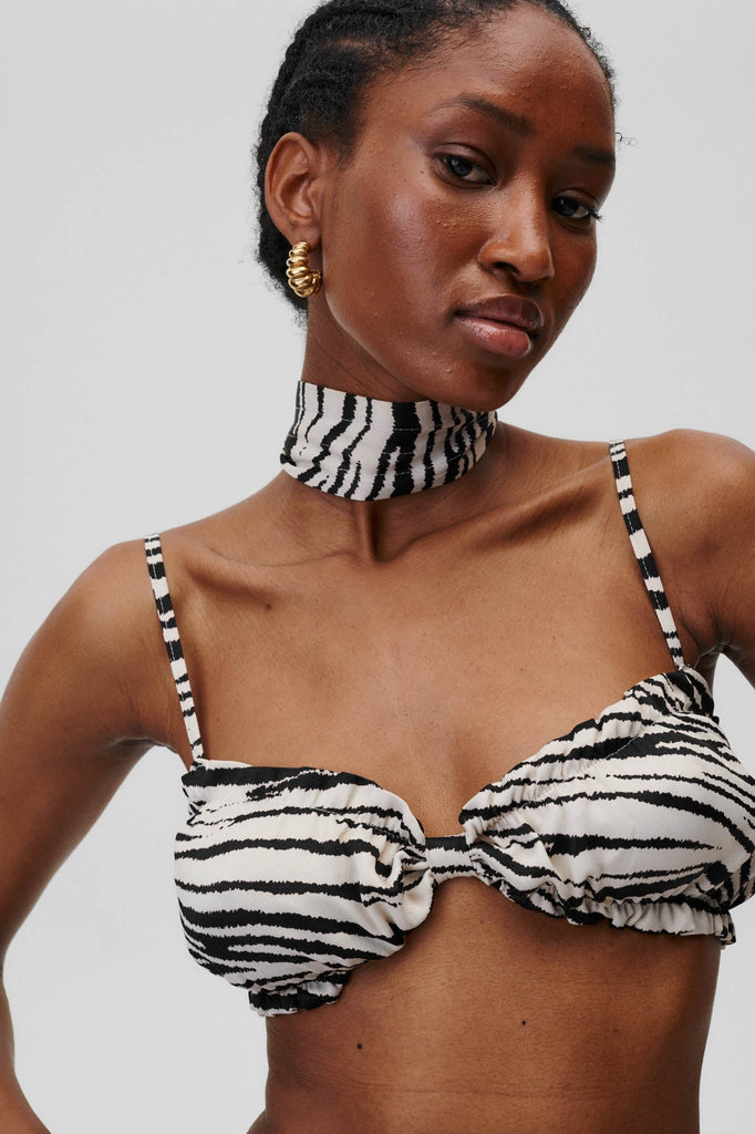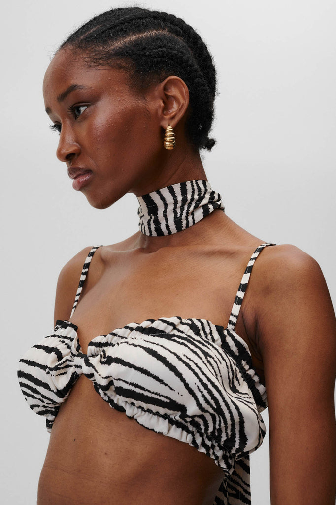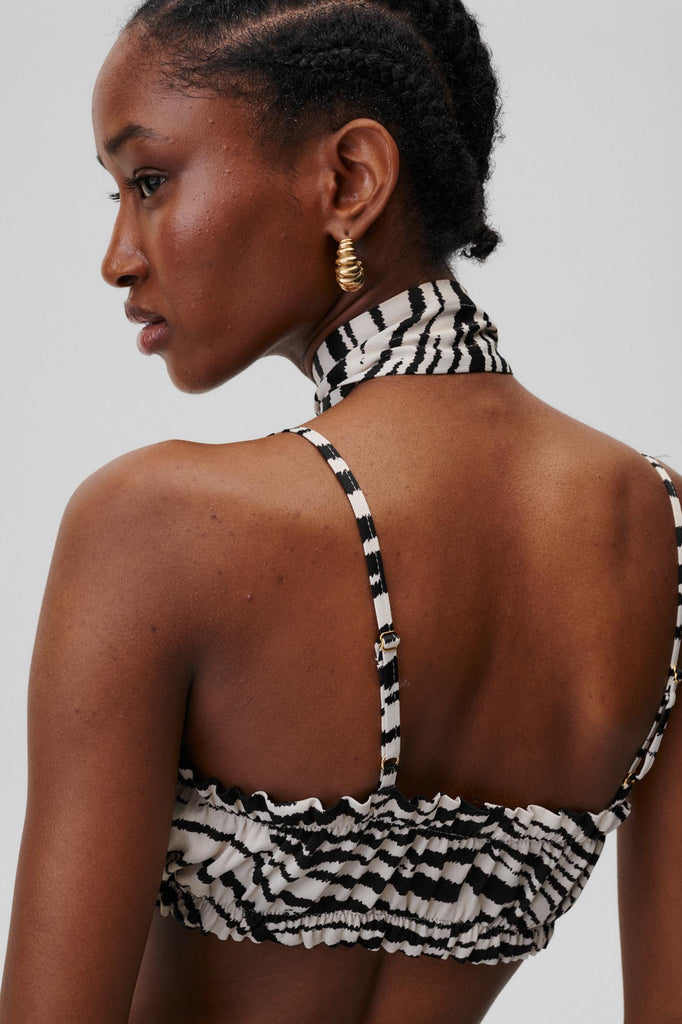 - Stworzony z oddychającej i wygodnej wiskozy w zebrowy print.
