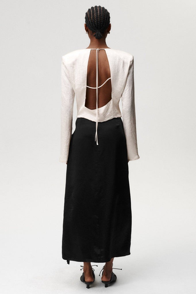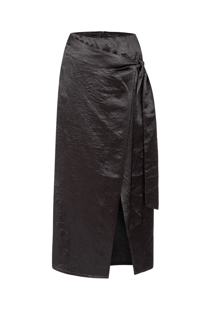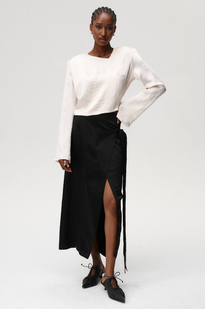 Lareina Skirt to klasyka z nutą odwagi. Kopertowy krój podkreślony dekoracyjnym wiązaniem z przodu i zmysłowym rozcięciem na nodze tworzy elegancką, ale nieoczywistą sylwetkę. Uszyta z satynowego acetatu z delikatnym, krepowym wykończeniem, materiał pięknie łapie światło i jest wyjątkowo przyjemny w noszeniu. Z połyskiem jedwabiu i swobodną formą, Lareina sprawia, że codzienne chwile stają się stylowym manifestem.