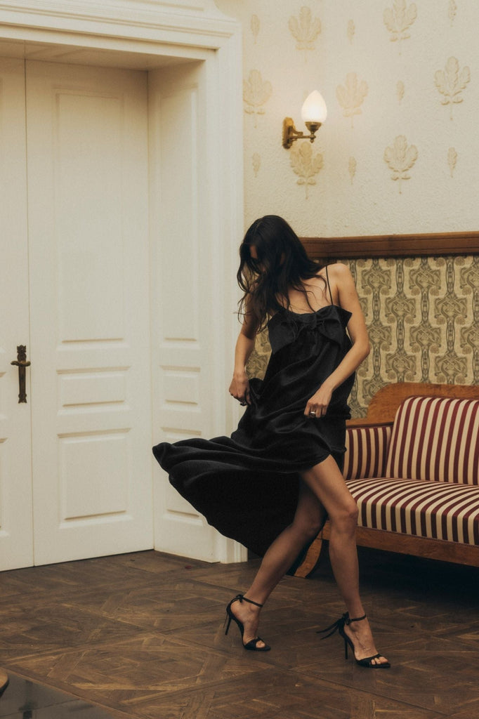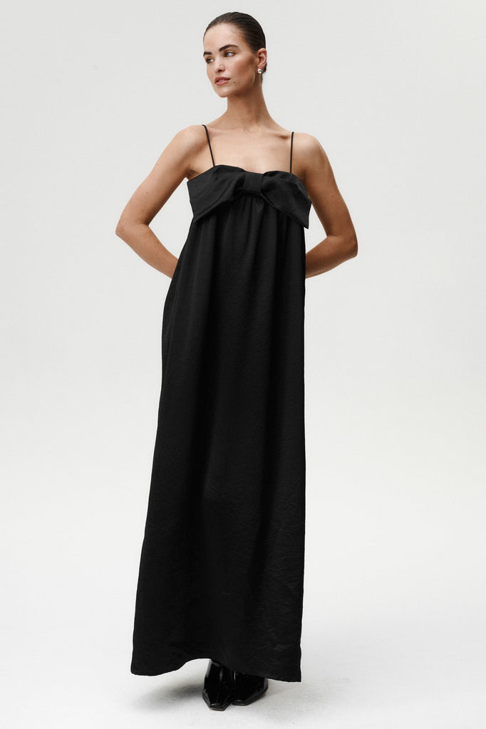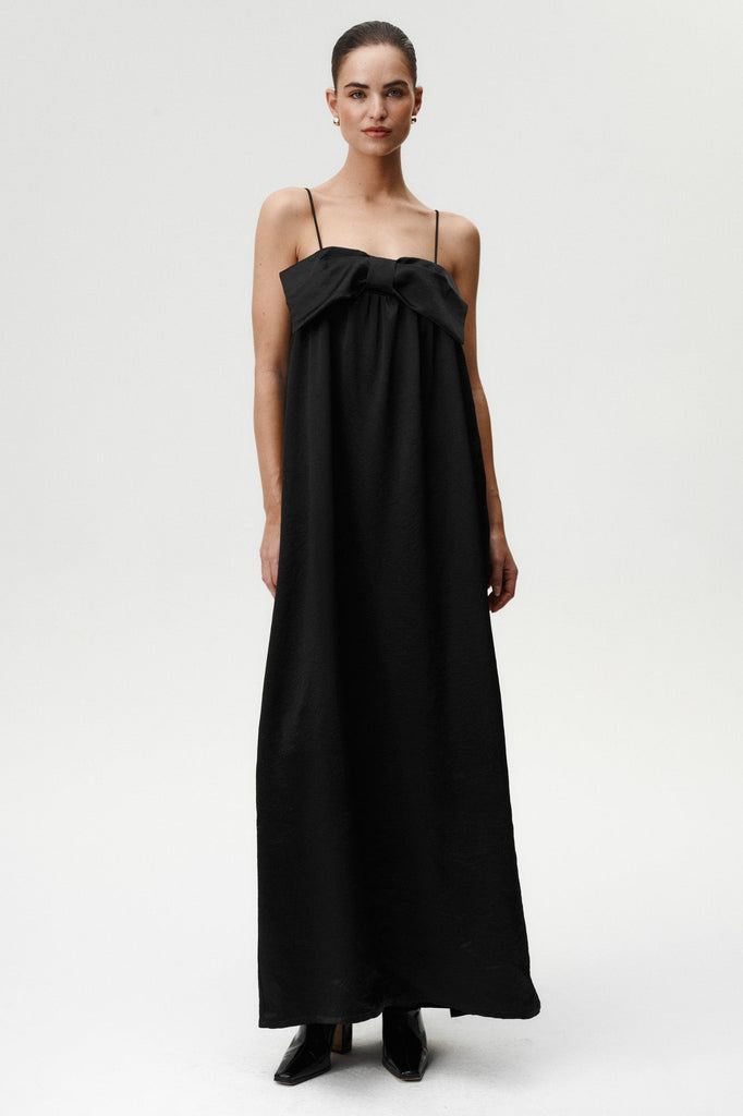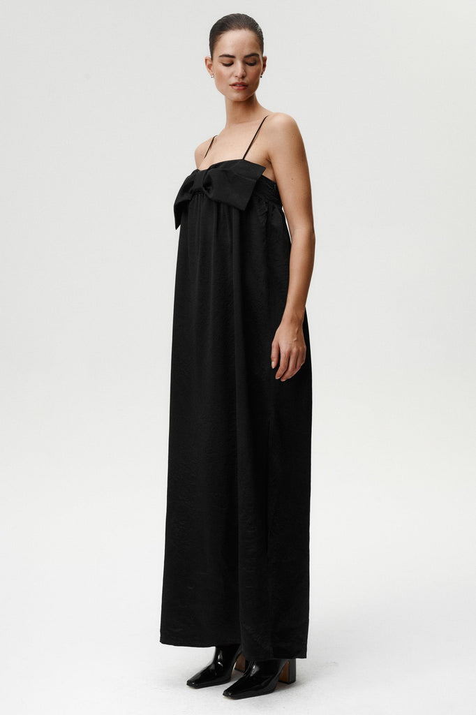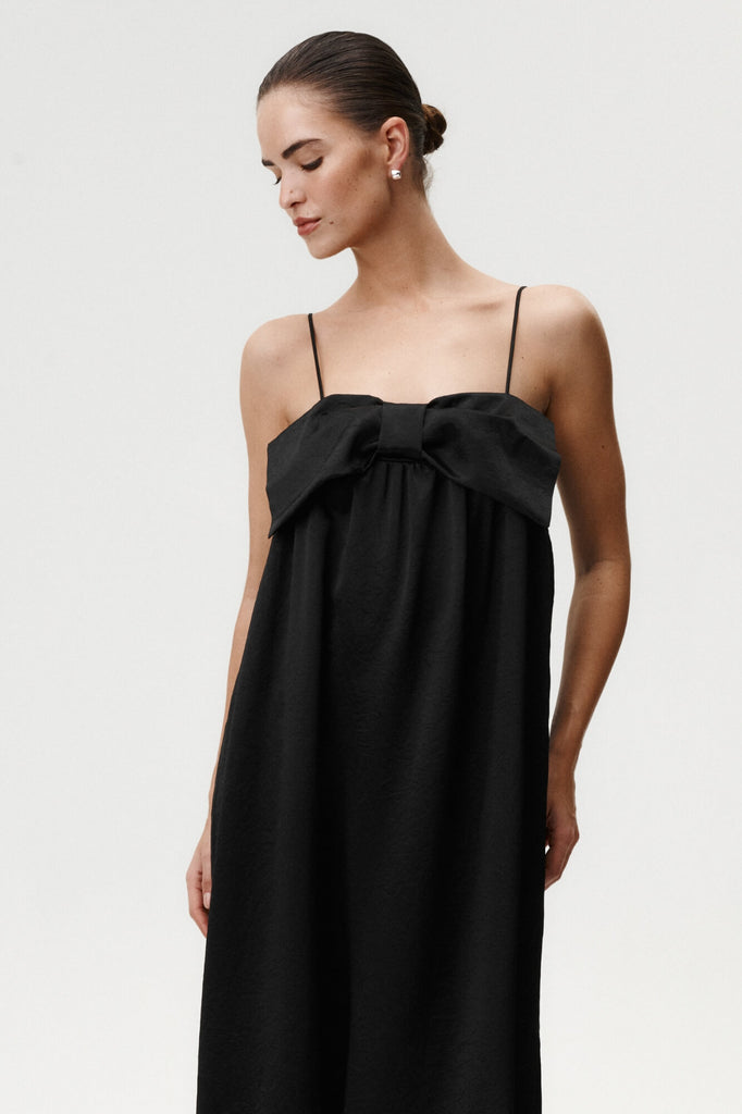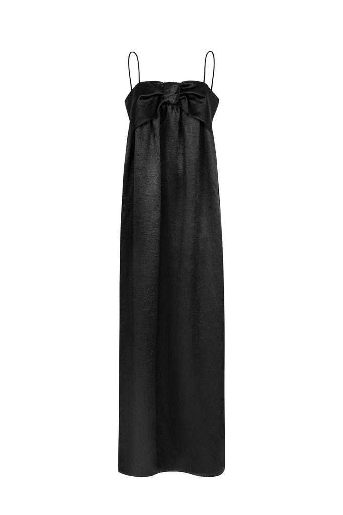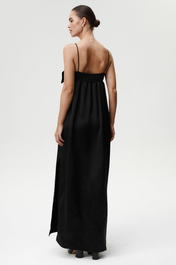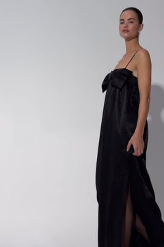 Nowoczesna interpretacja ponadczasowej elegancji. Belleza została uszyta z błyszczącego acetatu, który pięknie się układa i porusza razem z sylwetką. Strukturalna kokarda na biuście, przymocowana w górnych rogach, dodaje całości wyrazistego, kobiecego charakteru. Cienkie ramiączka, delikatne marszczenia pod biustem oraz rozcięcie z boku podkreślają figurę, zachowując przy tym lekkość i wygodę. Szeroki dół nadaje sukience subtelną objętość — idealną na wieczory pełne niewymuszonego blasku.