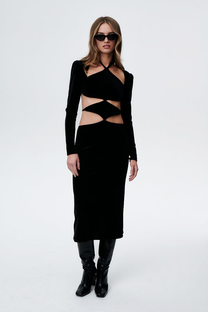Uwielbiamy nietypowe wycięcia. Material Girl to sukienka przyciągająca spojrzenia swoją nietypowością i detalami. Intrygujący przód i bardzo klasyczny tył, a do tego głęboka czerń weluru..