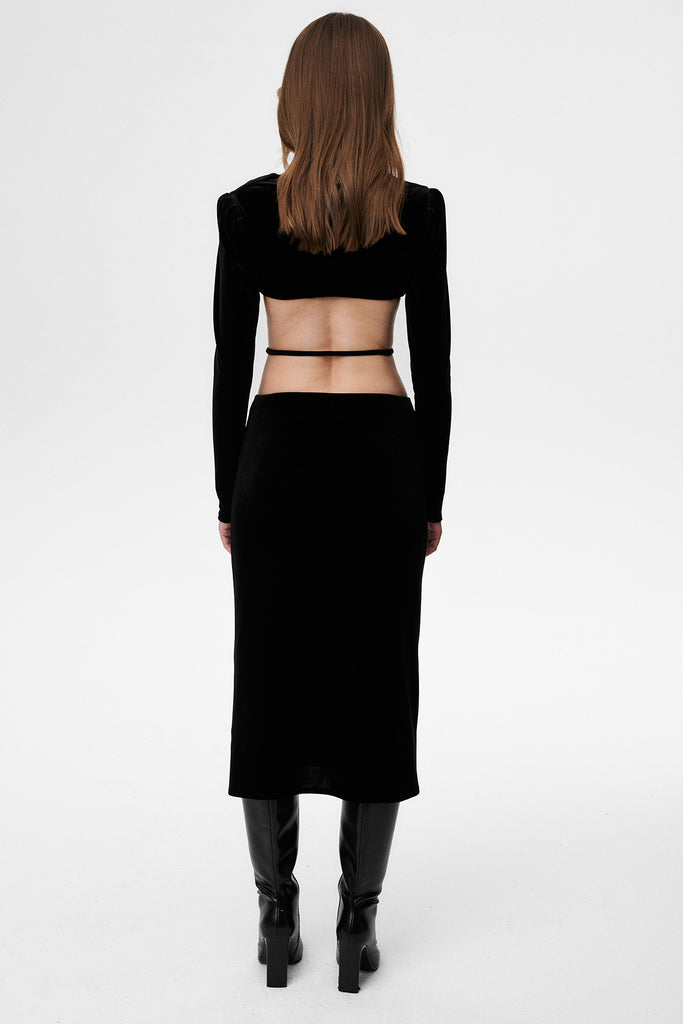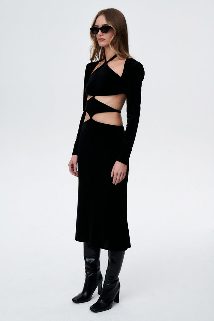 - Welurowa sukienka midi w wycięciami.