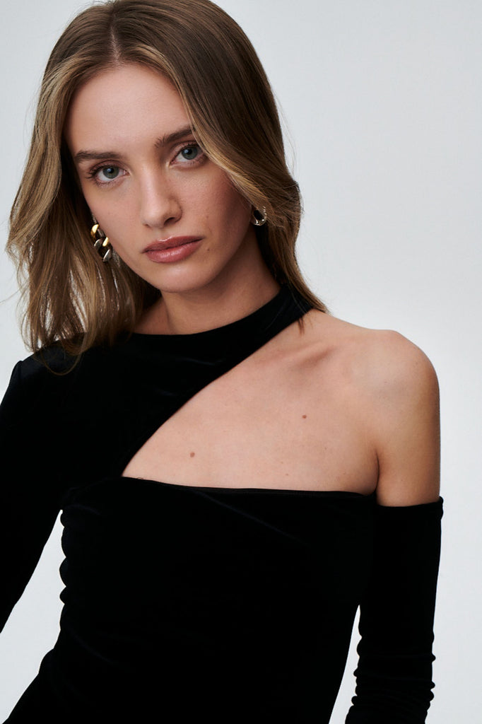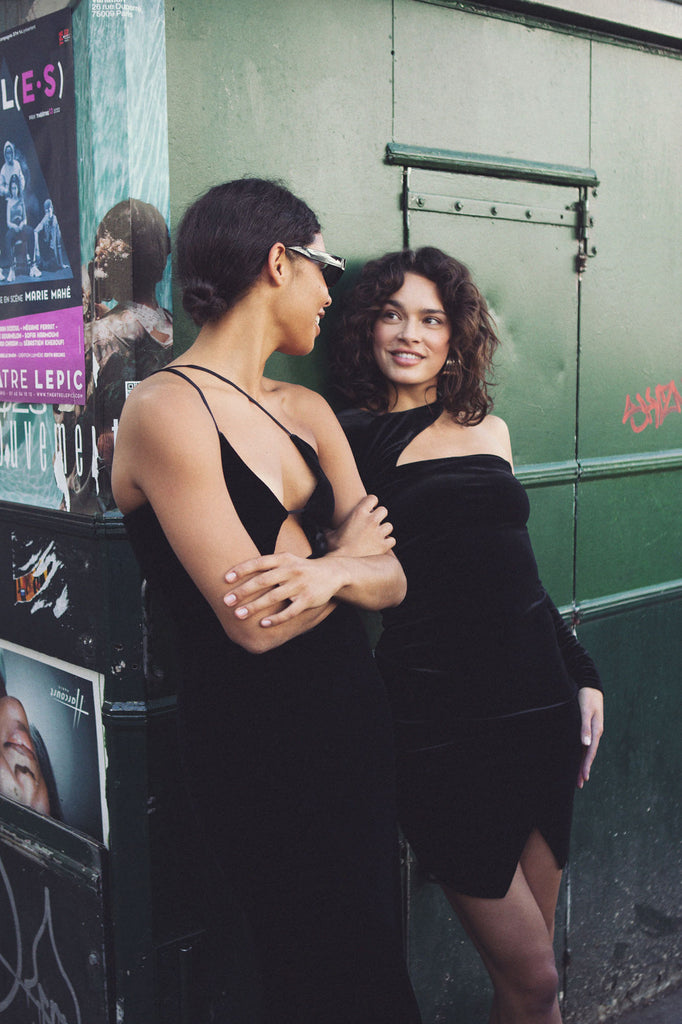 Czarna, welurowa mini z dużą dozą nonszalancji. Klasyczny krój, wycięcie pięknie podkreślające ramiona i głęboka czerń. Ta sukienka nic nie musi, po prostu jest - zachwycajaca i elegancka.