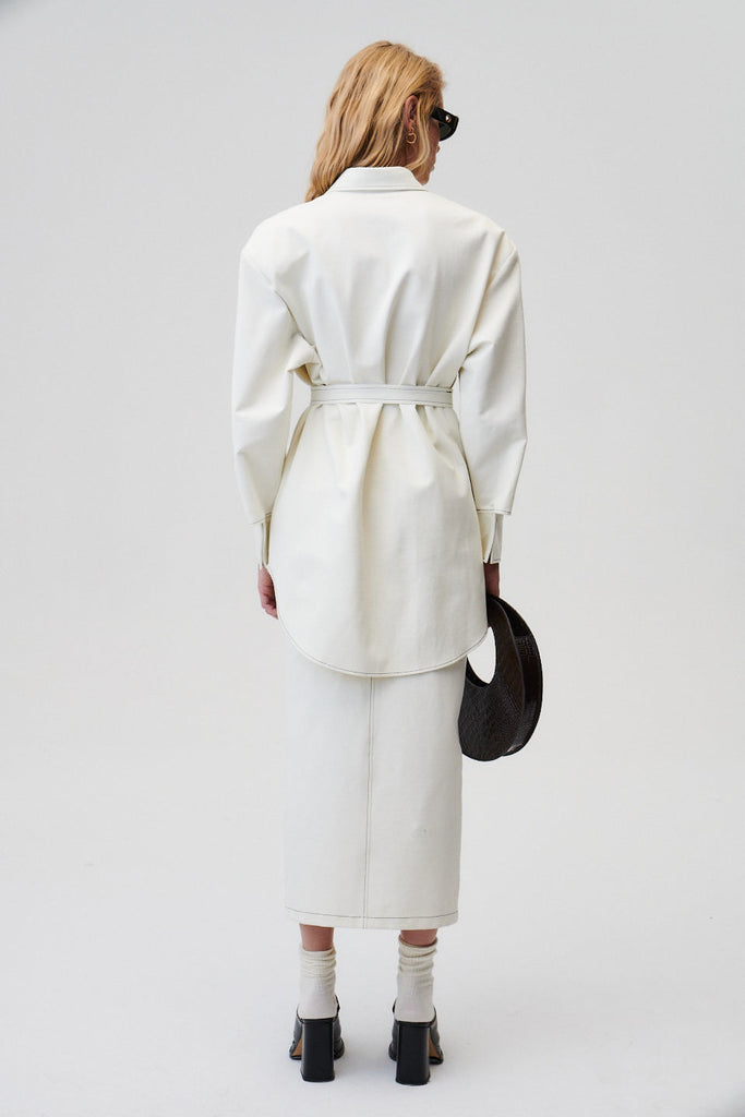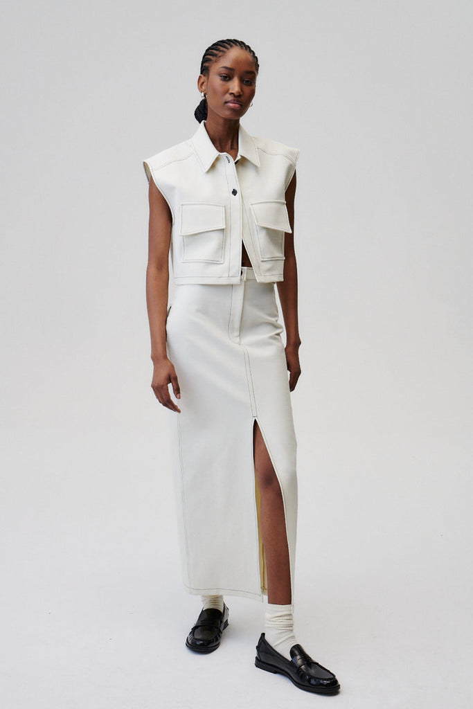 Spódnica Soft Gaze to połączenie minimalizmu z odważnym designem. Strukturalny wysoki stan, kontrastowe przeszycia i eleganckie rozcięcie z przodu nadają jej jednocześnie szyku i charakteru. Długość maxi i dopasowany krój tworzą wyrazistą sylwetkę, a kieszenie z tyłu dodają casualowego, użytkowego akcentu. Zestawiona z oversize’owym swetrem tworzy przytulny kontrast, a w połączeniu z dopasowanym topem nabiera nowoczesnej, eleganckiej formy. To element garderoby, który łączy prostotę z wyrafinowaniem.