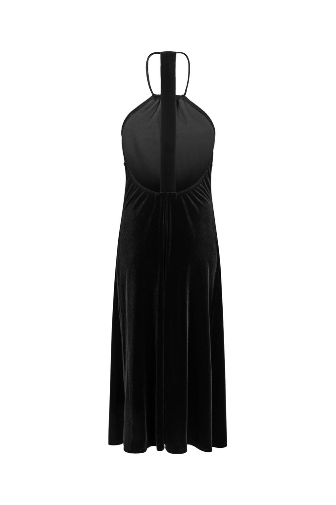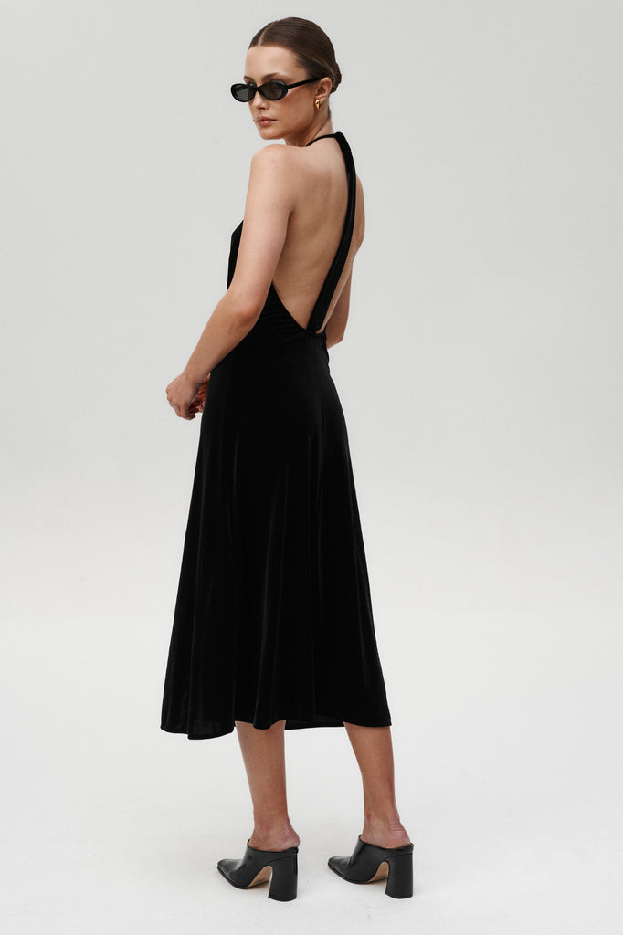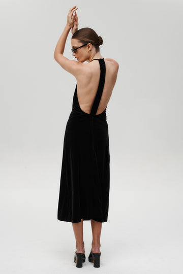 - Aksamitna sukienka midi z odkrytymi plecami.