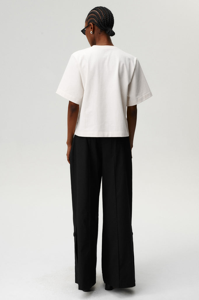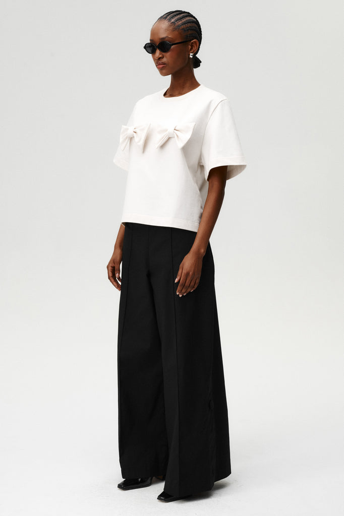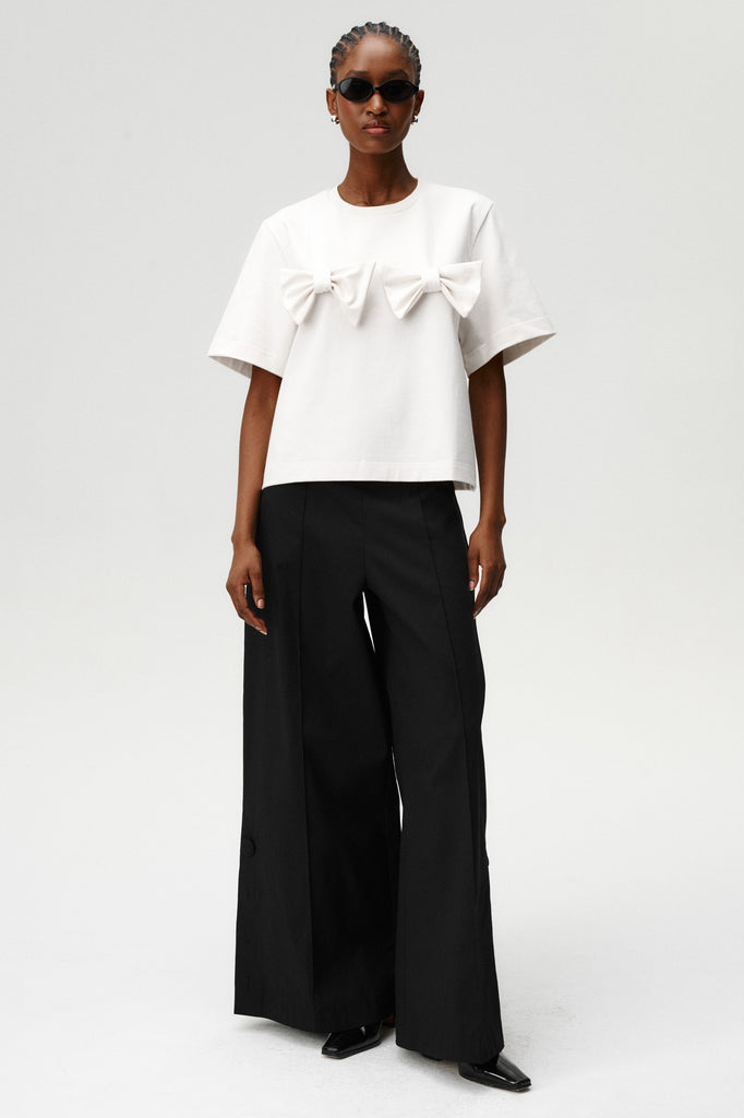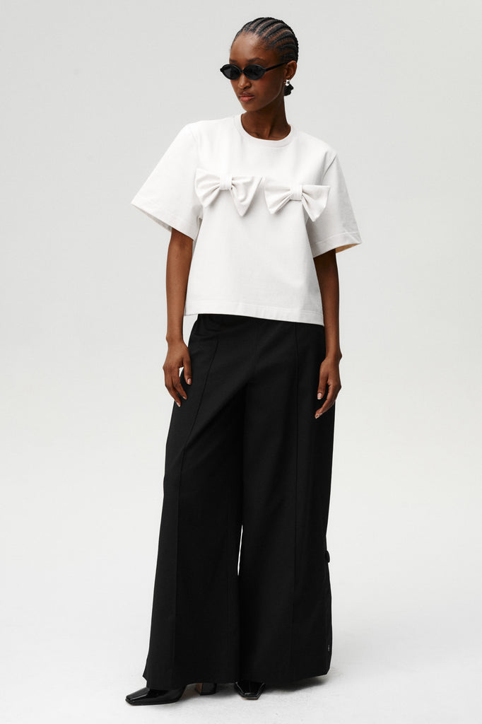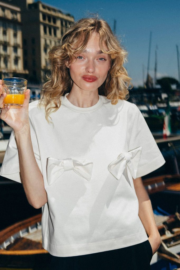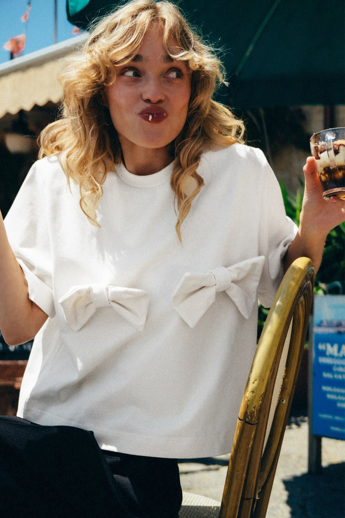 Codzienna klasyka z figlarnym akcentem — T-shirt Everly to propozycja, która daleka jest od zwyczajności. Uszyty z grubej, wysokiej jakości bawełny, zachwyca idealnie skróconym krojem i wyrazistymi, usztywnionymi ramionami, które nadają mu nowoczesny, zarysowany kształt. Dwie kokardki na biuście dodają uroku i zaskakującego detalu, przełamując prostotę odrobiną fantazji. Dostępny w klasycznej czerni lub subtelnej bieli, stanie się Twoim ulubionym elementem stylizacji — lekkim, stylowym i z charakterem.