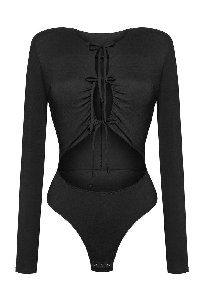 - Trzy wycięcia z przodu wraz z wiązaniami idealnie dopasowują body do sylwetki.
