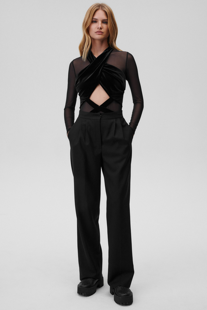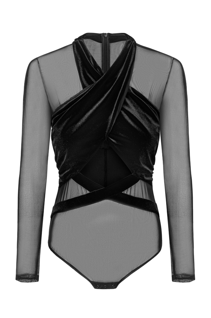 - Welurowe elementy imitujące wiązany top podkreślają sylwetkę.