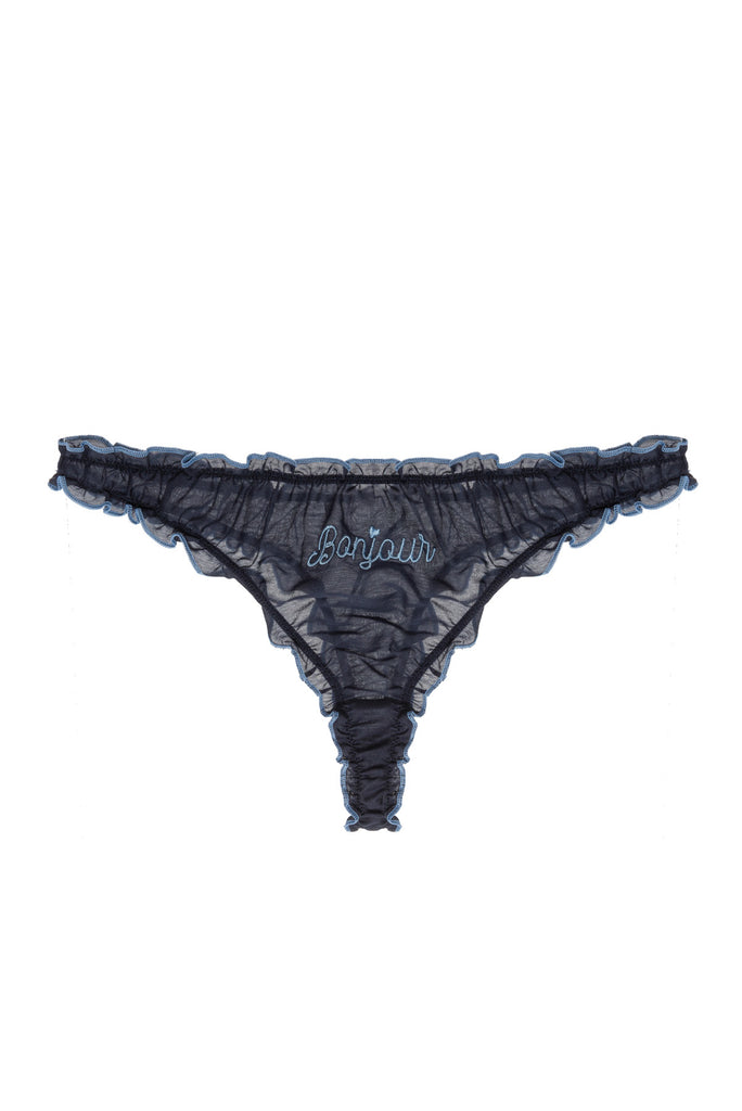 - Granatowe stringi z autorskim haftem ”Bonjour”.