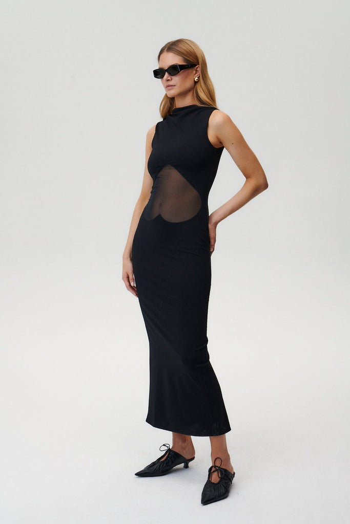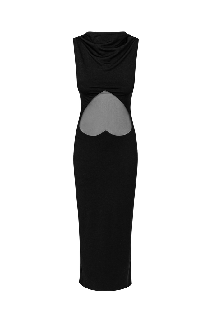 Sukienka maxi, która przyciąga spojrzenia i podkreśla pewność siebie. Dopasowany krój pięknie modeluje sylwetkę, a subtelne serce z siateczki na środku dodaje romantycznego akcentu. To sukienka wyjątkowe okazje i wieczory, które wymagają niezapomnianego looku.